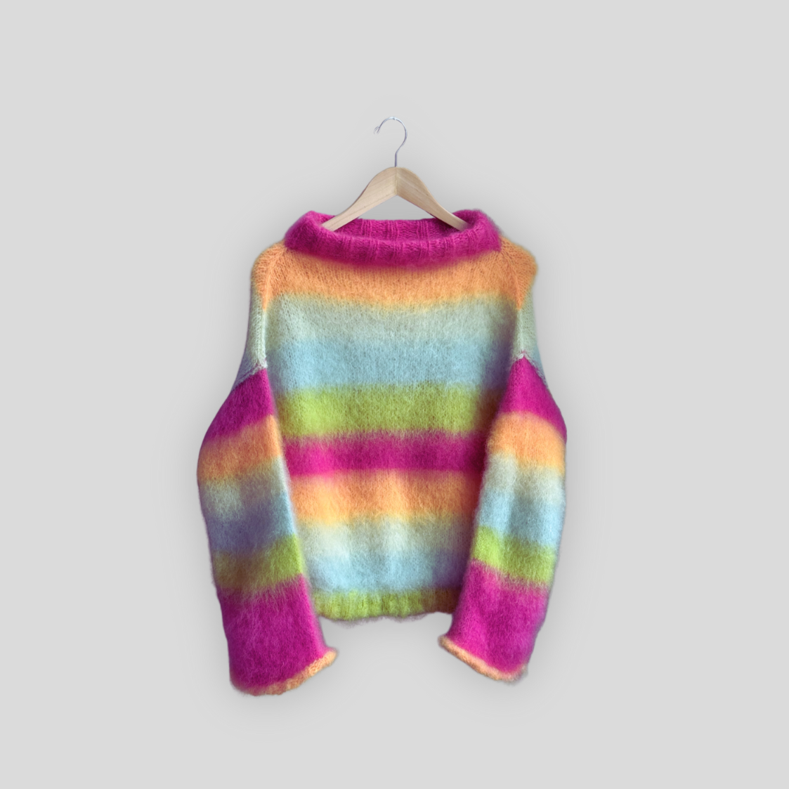 Wide pastel stripes of hot pink, lime green, baby blue, and sun-washed orange give this sweater its playful punch, while the airy mohair halo keeps it light, cozy, and wearable. Whether you’re hitting the slopes or layering it for everyday winter life, this sweater is meant to be seen.